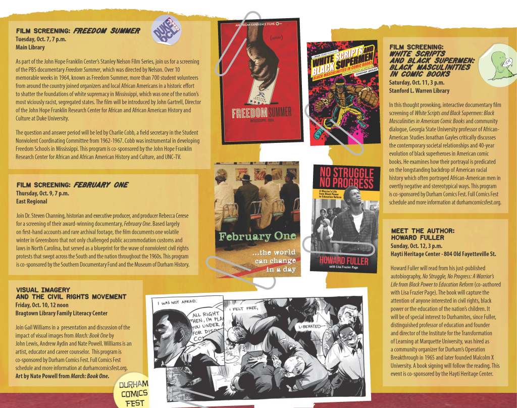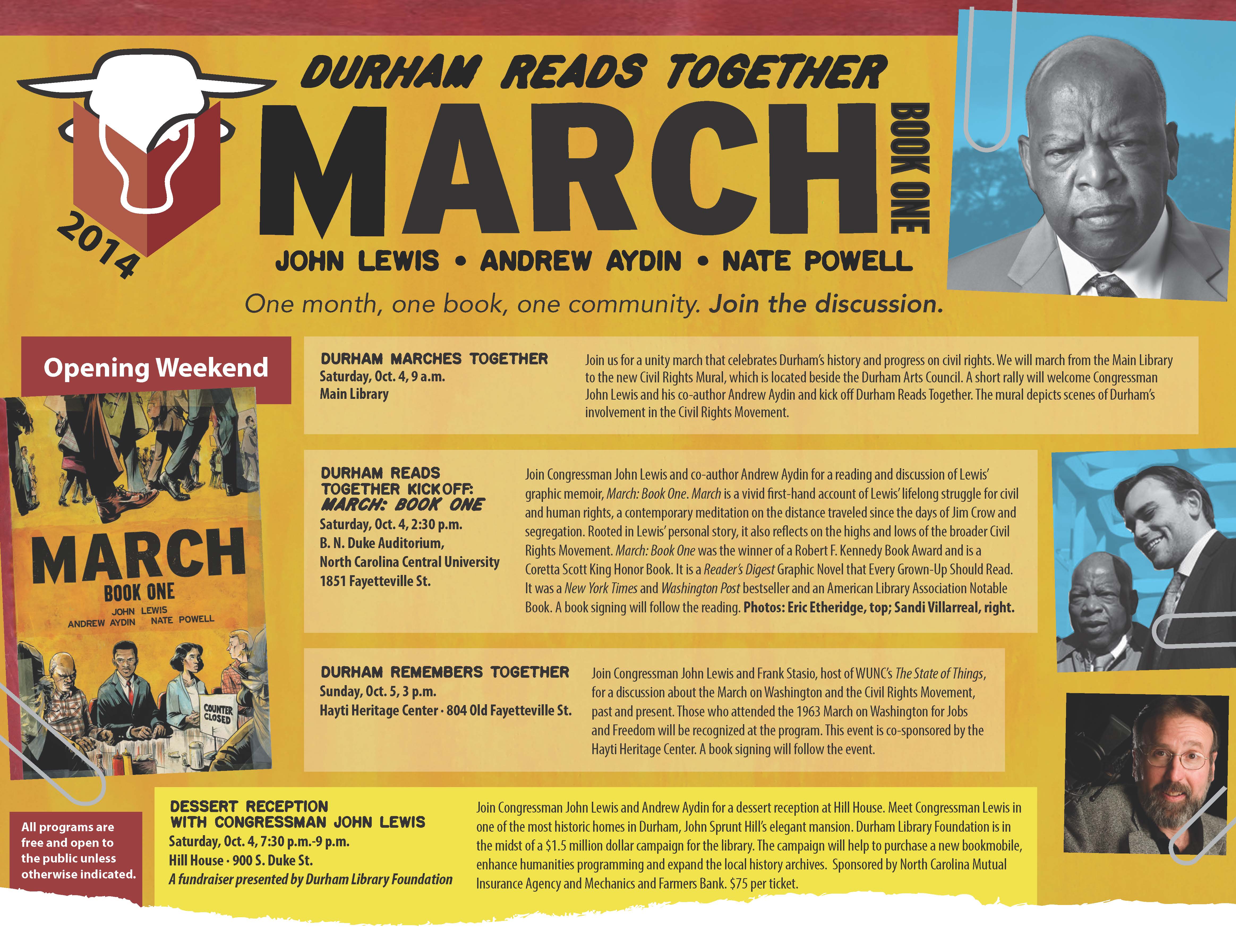 Pages for Durham County Library’s humanities programming calendar and promotional poster covering events from the 2014 edition of Durham Reads Together, its one-city-one-book program.