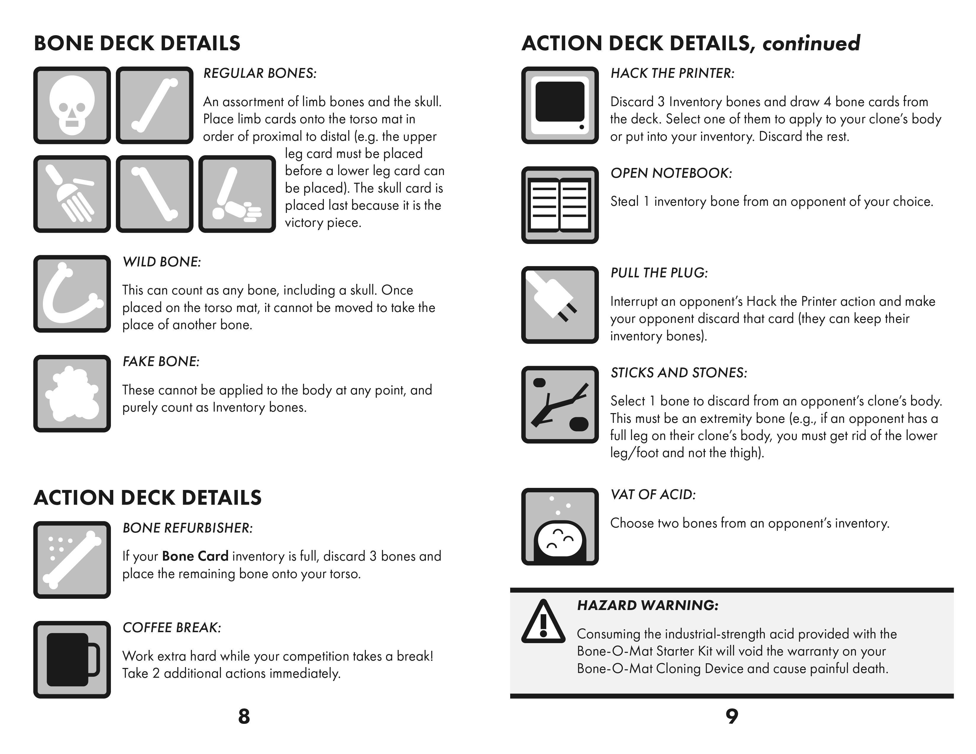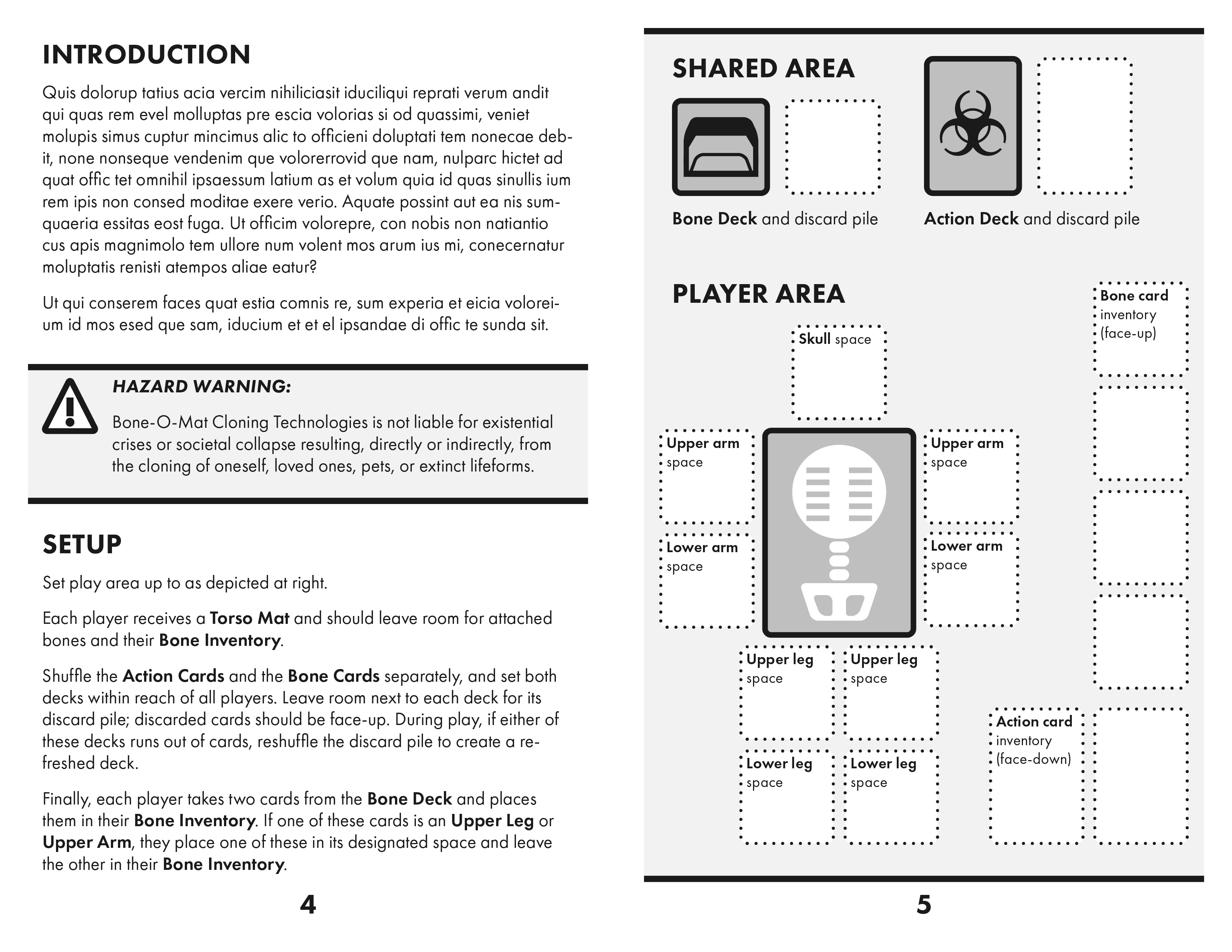 Manual for Clones N’ Bones, a tabletop game by Bianca Henderson, designed to resemble appliance instruction manuals.