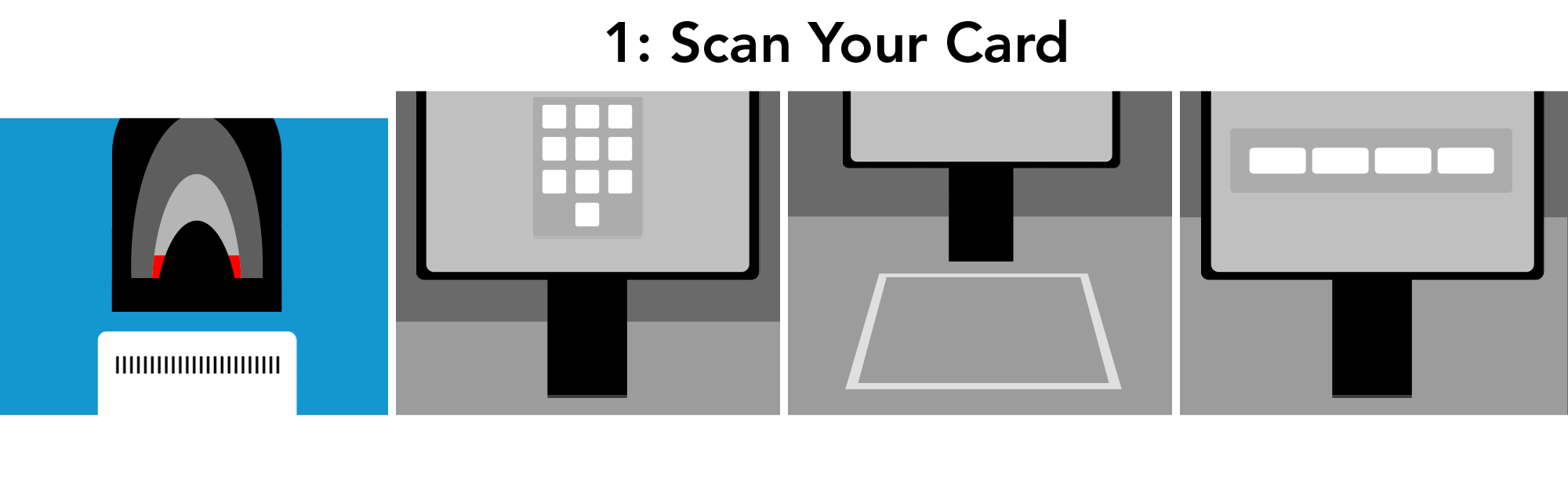 Step-by-step animated instructions installed on self-checkout computers used at Durham County Library, created with space (top left of image) for library system branding.