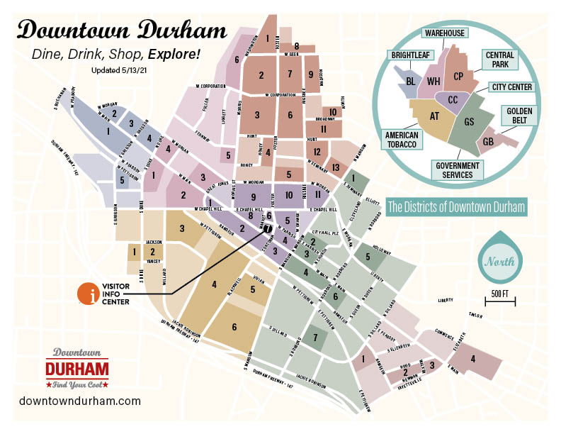 Printed map and accompanying printer-friendly PDF version created for Downtown Durham, Inc. featuring all shops, restaurants, bars, and walk-in services in the area’s business improvement district.